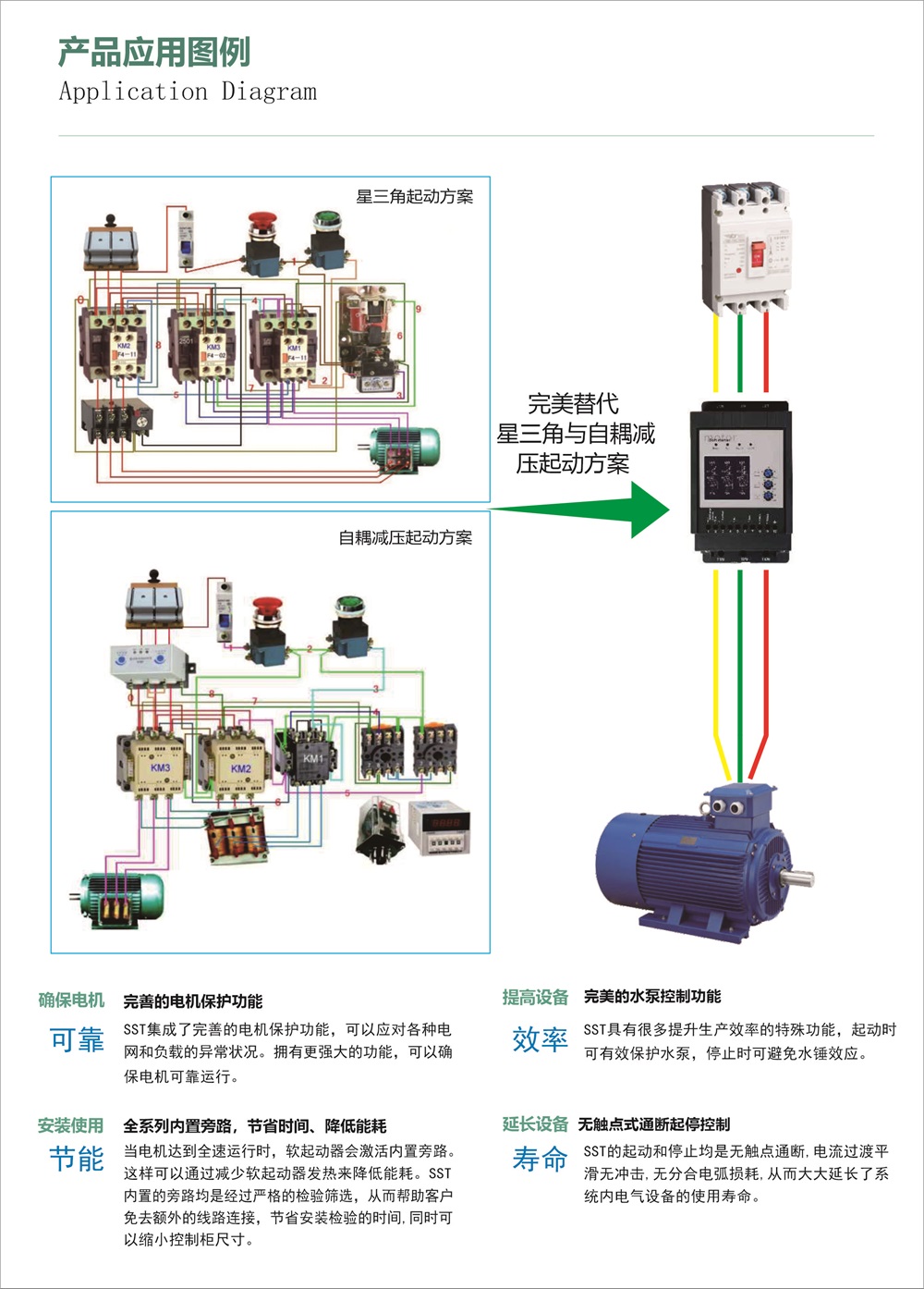 自主研发全新型数字式电机软起动产品 , 完美控制电机在起动过程中平滑加速、停止过程中平滑减速,并停供针对电动机及产品自身的保护功能。功率范围为0.75-75KW,支持单相电机规格,集成内置旁路和可扩展的紧凑型中小功率软启动器。广泛应用于机械设备配套。体积小适应性强。