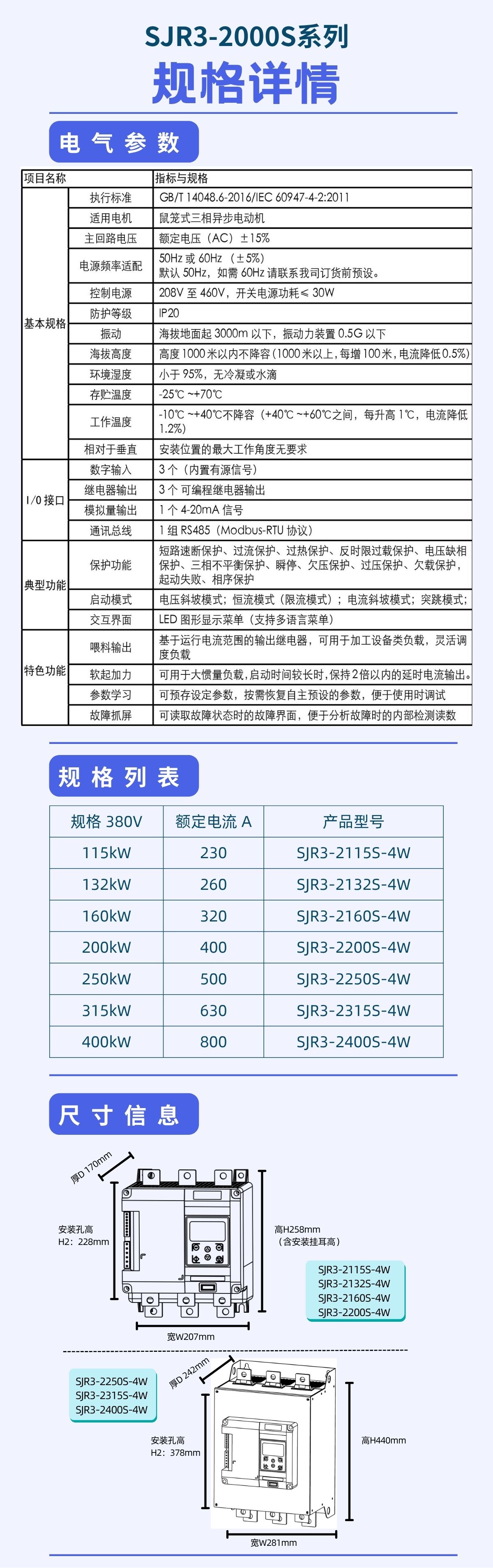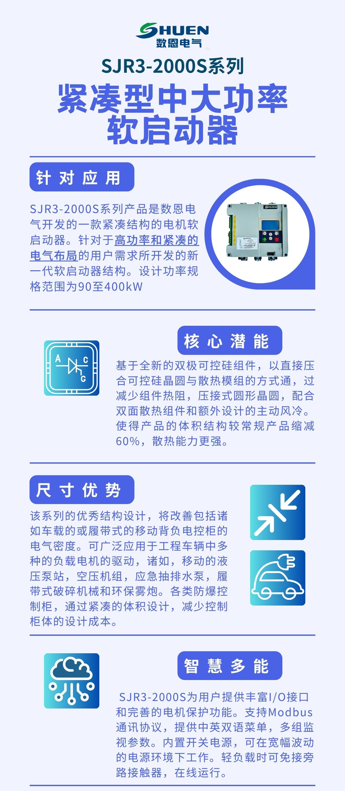 SJR3-2000S是PA视讯官方网站公司最新研发的超紧凑软启动器,针对紧凑的车载(履带式)电柜 / 防爆电箱 / 壁挂基业箱 提出高密度电气解决方案,兼容在线式应用的同时兼备有外置旁路连接方式,增加了欠载,运行次数,运行时间,线性的温度监控等多种功能,内置集成了RS485通讯总线,提供多语种菜单。